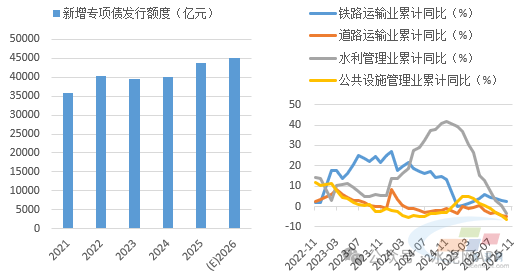 基建方面,我們判斷2026年投資將回正,基建端水泥需求將有改善?!笆逦濉币?guī)劃建議指出,加強謀劃論證,實施一批重大標志性工程項目,高質(zhì)量推進國家重大戰(zhàn)略實施和重點領域安全能力項目建設。2026年作為“十五五”開局之年,預計專項債、超長期特別國債發(fā)行規(guī)模將出現(xiàn)提高,基建投資將出現(xiàn)回正,但在化債政策影響下,水泥需求關系密切的交通類和市政基建投資或?qū)⒀永m(xù)低迷態(tài)勢,預計基建整體對水泥需求支撐將有所改善,但力度可能仍然不強。