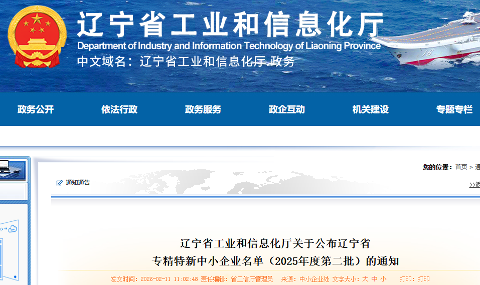 根據(jù)《遼寧省工業(yè)和信息化廳關(guān)于做好2025年度專精特新中小企業(yè)申報(bào)工作的通知》(遼工信明電〔2025〕2號),經(jīng)企業(yè)申報(bào)、各市推薦、專家評審、官網(wǎng)公示等程序,確定了遼寧省專精特新中小企業(yè)(2025年度第二批)和通過復(fù)核的遼寧省專精特新中小企業(yè)名單(2025年度第二批)。現(xiàn)將有關(guān)事項(xiàng)通知如下: