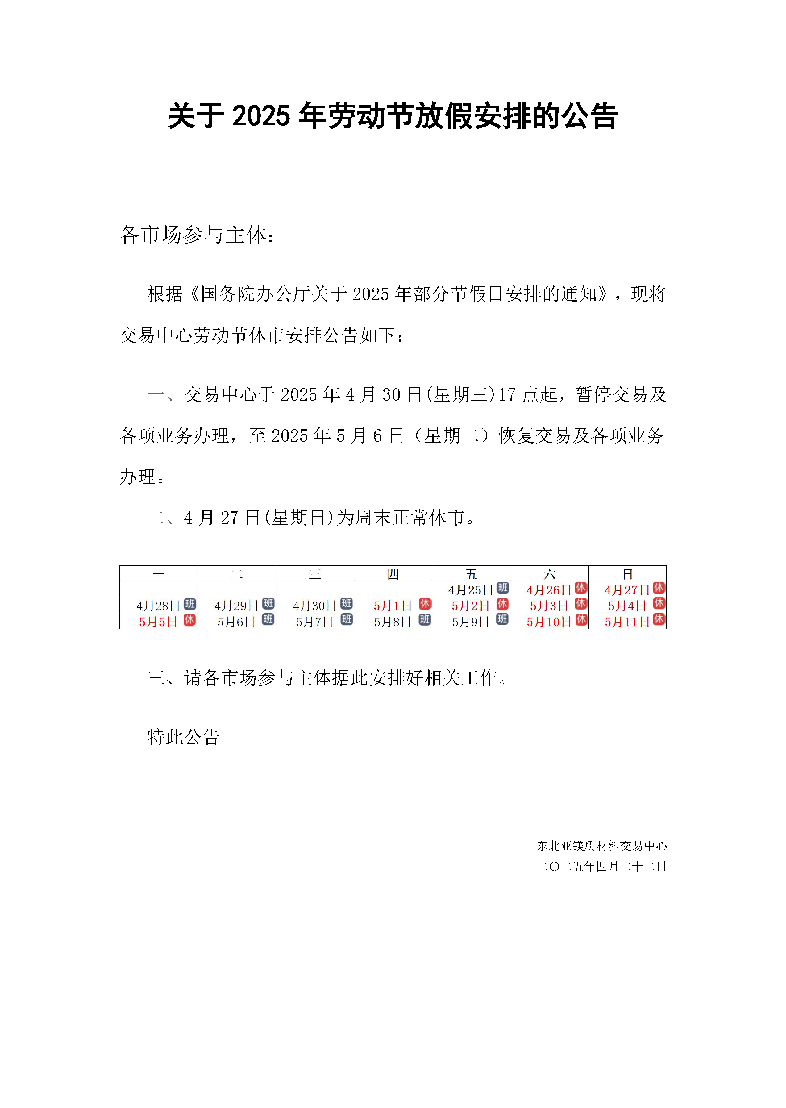 關于2025年勞動節(jié)放假安排的通知